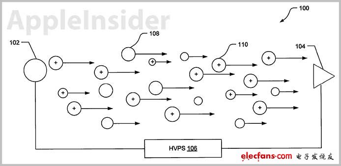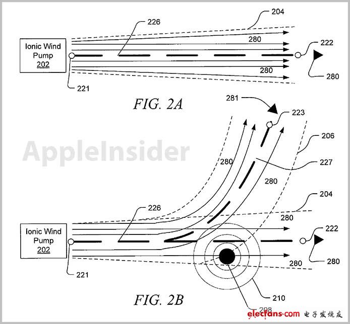 苹果美国第8,305,728号专利名为“冷却电子设备的方法与装置”,描述了一种通过磁场控制离子风在电子设备中的吹送方向和路径的技术。当代的主要散热技术是由机械风扇造成空气流动,随后将风在计算机内部以预定的路径送出,许多采用了被动热交换器,最终通过排气孔排出。