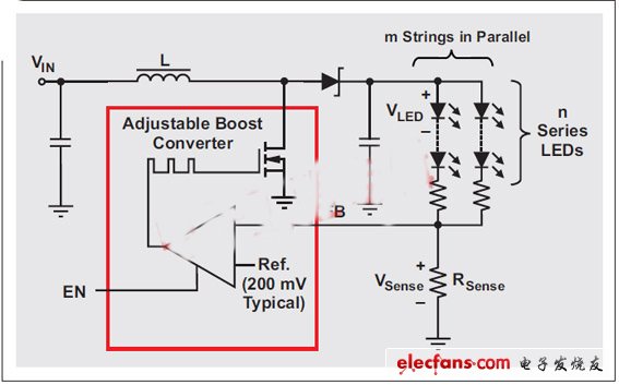 第三个要求,即陶瓷电容的可听噪声最小,与驱动器的拓扑结构有关。图1显示了一个简单的驱动器,其电流检测电阻器作为LED电流的接地通路。转换器对电流检测电阻器的电压进行调节,从而控制LED电流。