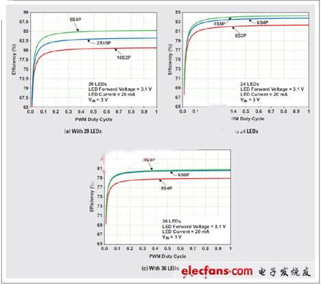 通过选择串的最佳数目以及每串LED的最佳数目,来最小化功耗和最大化电池使用时间,是一项具有挑战性的工作。使用更少的串,要求每串有更多的LED,并且会导致升压转换器更高的输出电压。升压转换器输入和输出电压之间的差异越大,其效率也就越低。另外,更多的串会导致更高的总输出电流,以及更高的电感和升压整流二极管损耗。图3显示了不同串联(S)和并联(P)组合时三种不同LED配置的模拟升压功率级效率。使用更多的串,可让每串的LED更少,并提供更低的输出电压,但它要求更多的电流阱,不得不消耗更多的功率,从而降低驱动器的总效率。