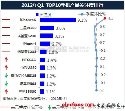 iPhone4S继续领跑产品关注度排行并拉大其优势