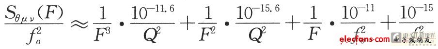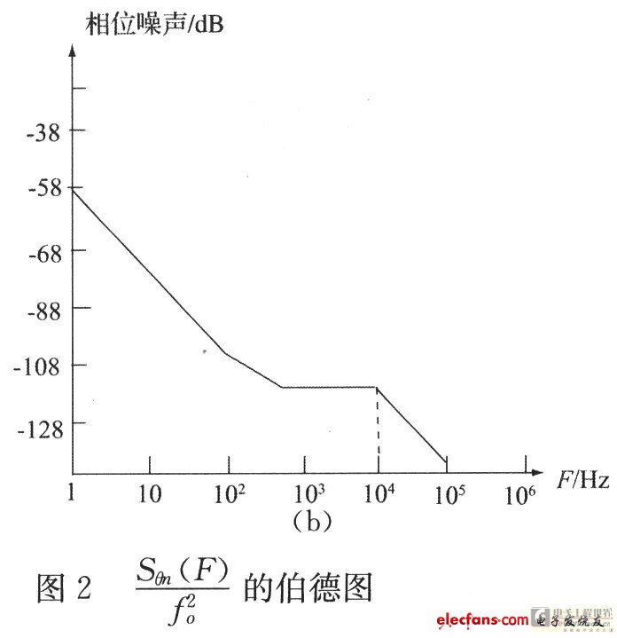 一起画到图2(a)中,可见两噪声谱交于F=104Hz附近。综合考虑,选择在两谱线相交频率处显然是最有利的,即fn=104Hz。分别过滤后相位噪声如图2(a)虚线所示。由图可见,晶振噪声经过低通过滤以后,在F》fn的高频段内噪声谱已低于晶振的噪声。图2(a)是归一化的输出相位噪声,实际输出的相位噪声应乘以fo2,如图2(b)所示。
