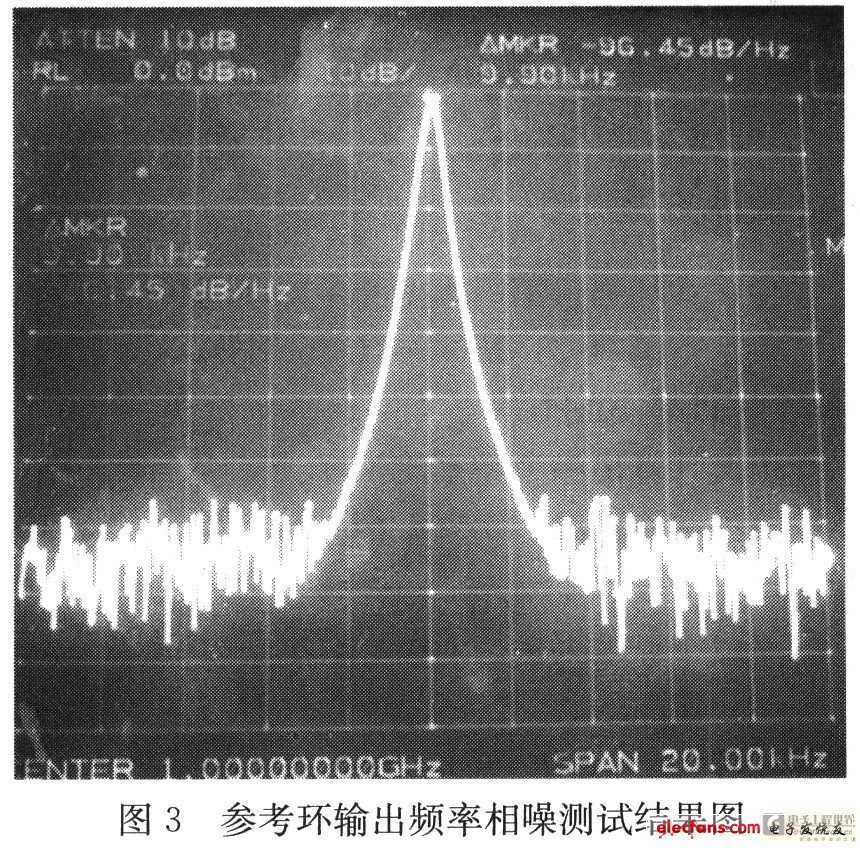 实际电路中通过提高参考环输出频率至500MHz~1000MHz再16分频来获得参考信号就可以使本振环参考频率的近端相位噪声得到20×LOG(16)dB即24dB的改善,参考环输出频率的相位噪声只需达到-94 dBc/Hz@10kHz就能满足指标要求,实际测试中输出信号的单边带相位噪声为-96dBc:/Hz@10kHz,完全满足指标要求。参考环通过提高输出频率而后分频的方式提高本振环的参考信号的近端相噪,从而提高第一本振近端相噪。