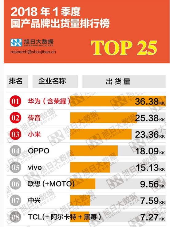 旭日大数据发布了2018年第一季度的国产手机出货量排行榜TOP25,包括智能手机和功能机,包括国内市场和海外市场。华为+荣耀轻松领先其他对手,出货量达3638万部,而位列第二的是非洲之王传音,出货量也有2538万部,当然从其一贯产品构成看,功能机占70%以上。