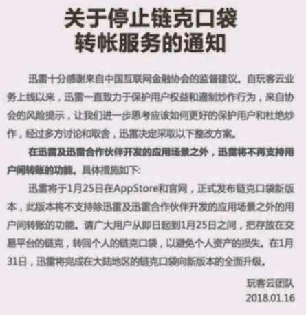 迅雷将于1月25日在AppStore和官网,正式发布链克口袋新版本,此版本将不支持除迅雷及迅雷合作伙伴开发的应用场景之外的用户间转账的功能。请广大用户从即日起到1月25日之间,把存放在交易平台的链克,转回个人的链克口袋,以避免个人资产的损失。在1月31日,迅雷将完成在大陆地区的链克口袋向新版本的全面升级。