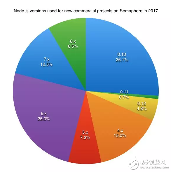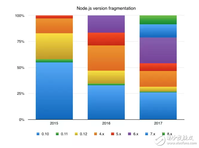在过去的几年中,Node.js 运行时发生过很多变化,最终整合了新的发布时间表。实际情况是,几乎三分之一的项目都是使用过时的 Node 版本,而不到10%的项目使用 2017 年发布的版本(v8或v9)。