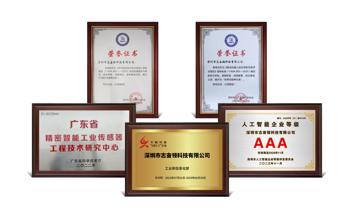 不断深耕投入换来的是丰硕的成果,同时也得到了业界的肯定,比如参与了两个行业标准的制定(平行电动夹爪技术规范和移动机器人定位导航性能评估规范);获得了国家专精特新“小巨人”称号;被评定为全国首批AAA级人工智能企业;广东省精密智能工业传感器工程技术研究中心获得省科技厅批准;承担了深圳市科创委科技重大专项的高精密激光位移传感器项目;主导和参与了多个省市工业技术攻关并获得通过。