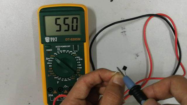 .怎么利用呢?如果在一开始对这个三极管一点都不了解的情况下,自己可以试着把三极管的三个管脚插到插孔里面,如果插进去之后,在万用表的显示屏上能够显示出比较大且较为稳定的数字,那么我们就插对了,我们可以根据插在表孔处的位置所标注的信息来判断,我们在上一篇其实也是利用了这一点,使用这个方法不但能够辨别出管子的类型,其实我们还可以辨别三极管管脚,下面两张图是测量PNP型还有NPN型实拍图。