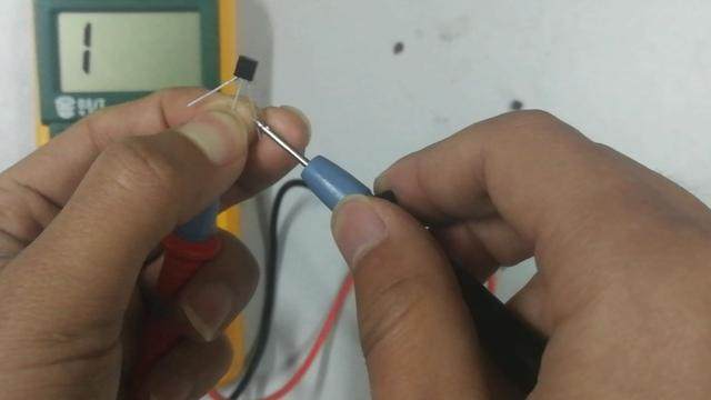 第一种方法仍然使用万用表上的二极管档,在上篇文章中我们说到当把红表笔连在基极上,黑表笔连在另外两个管脚上会在万用表的显示屏上显示出数字,就像下面这两张图一样,我不知道大家试没试,可能有网友在实际测试的时候发现结果并不是这样,当把红表笔放在基极上黑表笔去接触另外两个管脚,万用表始终显示1,并不能显示出比较大且稳定的数字,正如下面的第三张图