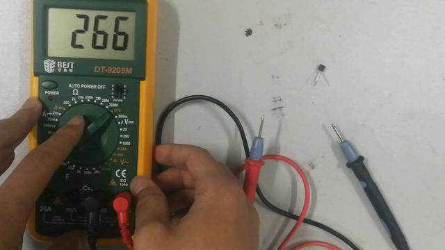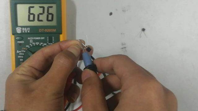 如果是新手可能直接判定这个管子坏掉了,其实不是这样的,如果有耐心继续测试你会发现,当把黑表笔放在中间那个管脚上,红表笔去接触另外两个管脚,这时候在显示屏上竟然能够显示出数字,大家可以参考下面的两种实拍图,你可能会觉得我们上篇所描述的是个错误的结论,别忘了我们有个大前提,是以NPN型三极管为例的,而出现这种“反常”的现象正是PNP型三极管的特征。