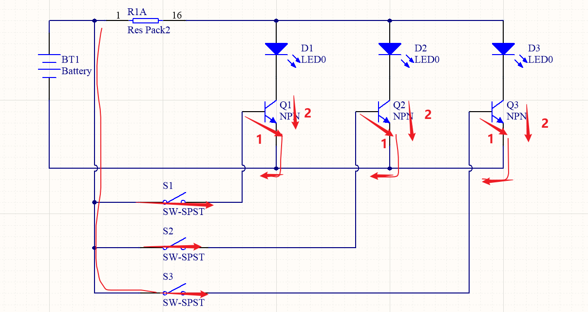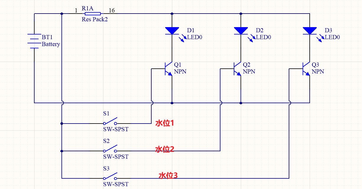 首先可以先看一下,当容器里面的水很少时,也就是在水位3附近时,根据电路可以看出只有开关S3因为水是导体进而导通,此时电通过三极管Q3的基极-发射极驱动三极管Q3导通。