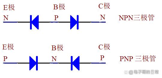 三极管种类大致分2种,一种NPN型三极管,另外一种为PNP三极管。三极管由2个PN结组成。因此,我们可以将三极管看作由2个二极管组成。通过下图可以知道,三极管的公共端为B极(基极)。