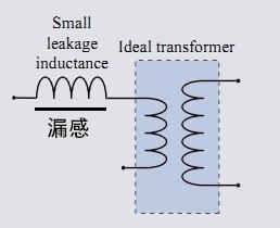 但实际中变压器总是不理想的,总有一部分磁通不参与能量传递,在原边兴风作浪,产生很多不利影响。这部分不传递能量到副边的磁通产生的电感就是漏感,实际变压器的等效图如下: