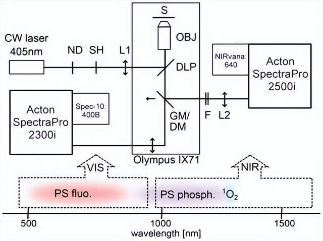 图 1:NIR 发光显微光谱设置:图的下部描绘了 VIS 和 NIR 路径检测到的光谱区域。