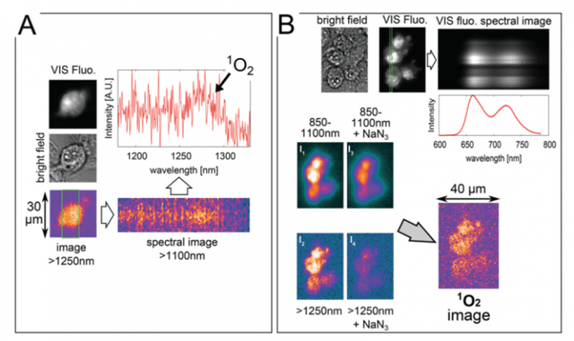 该实验装置利用两个检测通道(VIS和NIR)对单线态氧和光敏剂的非常弱的近红外磷光以及光敏剂的可见荧光同时进行实时成像。这种创新装置(见图 1)能够采集基于单线态氧和单个细胞光敏剂发光的光谱图像。图像的一个维度是空间维度,另一个维度是光谱维度,涵盖 500 至 1700 nm 的光谱范围。