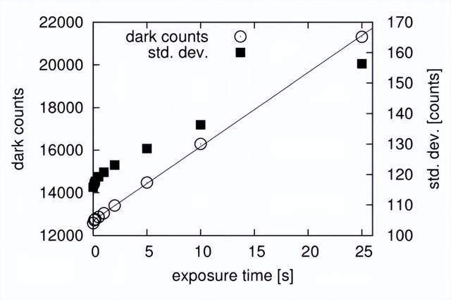图 5:每帧不同曝光时间的每像素暗计数和标准差(NIRvana640 相机)。