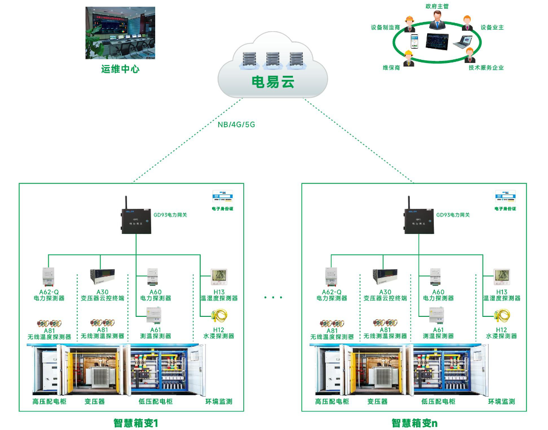 本系统是以箱式变电站为管理对象,加装箱变网关,在完成箱变智能化改造的基础上,依托电易云,构建一体化智慧箱变及运维系统。