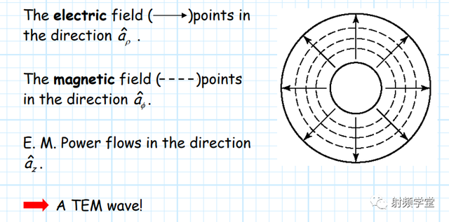 上图是同轴线的示意图,有内导体和外导体组成,因为内导体和外导体共轴,所以称作同轴线。同轴线传输的主要模式是TEM模,高次模除了TEM模的倍频,还有空腔导致的TE、TM模。我们所用到的同轴线都是在TEM模式下工作的,其场分布如下图所示:电场从内导体外表面到外导体内表面,磁场环绕内导体,在长度方向上周期分布。