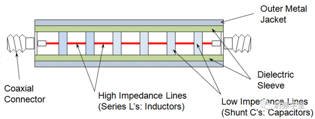 外导体越粗,阻抗越高,内导体越粗,阻抗越小。这个在糖葫芦低通里面特别明显,如下图所示,它的高低阻抗就是靠改变内导体的粗细来实现的。