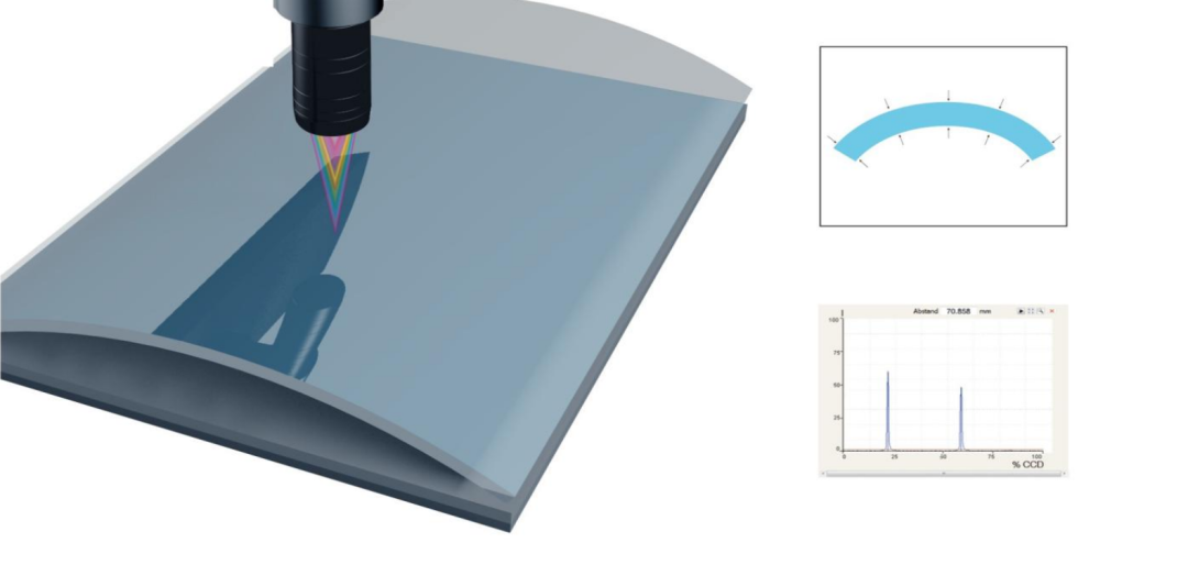 1、反光强玻璃表面光滑,反光强,若采用激光三角和结构光测量方法,反光表面的漫反射信号将对测量信号造成严重干扰,测量数据精度较差。而光谱共焦测量技术利用表面反光进行测量,适合玻璃表面的测量任务。