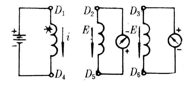 2)把另一相的一个线头接电池负极,另一个线头碰电池正极。如果指针向(+)偏转,则与电池正极相接的线头是尾端,与电池负极相接的线头是首端。如果指针向( - )偏转,则与电池正极相接的线头是首端,与电池负极相接的线头是尾端。