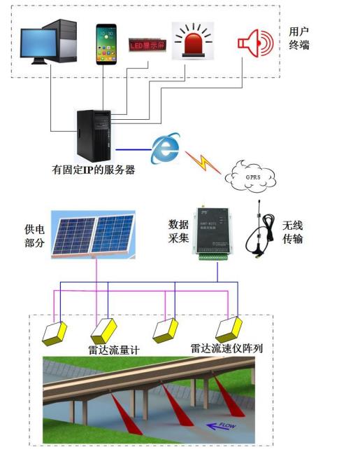 雷达流量计是一款基于微波技术的全自动流量计,它采用 24G K 波段平面雷达技术,通过非接触的方式测量水体的流速和水位,根据内置的软件算法,计算并输出实时断面流量及累计流量;该产品具有功耗低、体积小巧、可靠性高、维护方便的特点;测量过程不受温度、泥沙、河流污 染物、水面漂浮物等因素的影响。雷达流量计的组成包括:雷达流速传感器、雷达水位(液位)传感器、流量积算模块、安装支架组成。根据雷达流量计所测得的水位,结合每个测流分区的河床断面高程,即可得到整个流量监测断面各个测流分区的水位值。雷达流量计测得的流速值对应其所在测流分区的流速值。。雷达流量计依据所测断面的流速及断面面积计算流量,是在不改变河流边界的条件下准确测量流量的一种较好的非接触式测量方法。雷达流量计通过 RS485 总线读取各个流速仪测得的流速值,并根据内置模型,将各个测流分区的表面流速转换成相应测流分区断面的平均流速。结合各个断面的几何参数及水位,雷达流量计计算出整个断面的瞬时流量,并自动统计累计流量