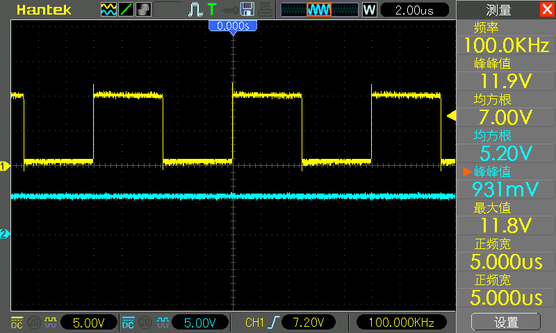 随着输入方波频率的进一步提高,波形进一步平坦。在 100 kHz 时,几乎已经没有方波了。此时,与输入方波从高电平到低电平切换所需的时间相比,在电感器中存储和释放能量需要更长的时间。因此,在这种情况下,电感器开始逐渐抹平电压。