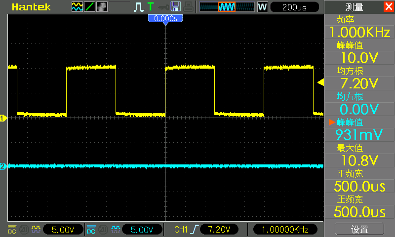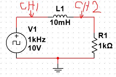 现在让我们通过一个小小的电路学习电感。方波信号源设置如下:占空比:50%,峰峰值:10 伏,偏置:5 伏。