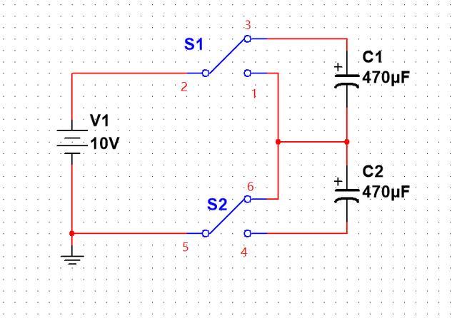 在实际工作的印制电路板(PCB)中我们没法用手去移动电容,即使真的能移动电容,雇一个人在每块电路板旁边移动电容也是不现实的。我们可以设计一种电路来模拟这种移动电容使之串联起来的过程。电路原理图如下: