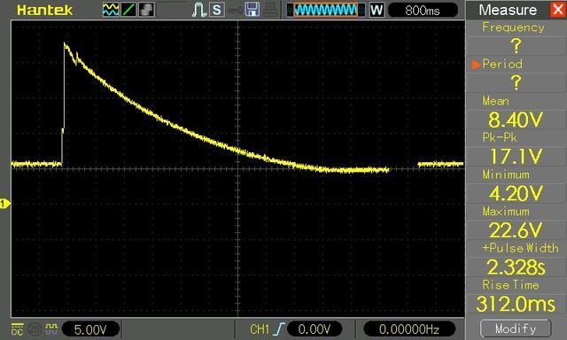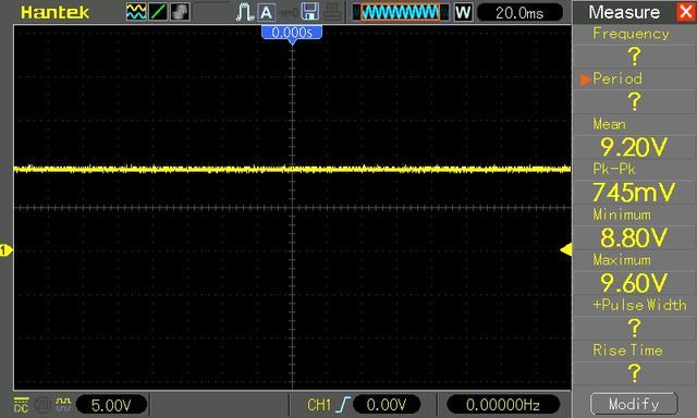 第一次上电,未按下开关,此时C1充电,示波器显示,平均值 9.2V, 接近电源电压: