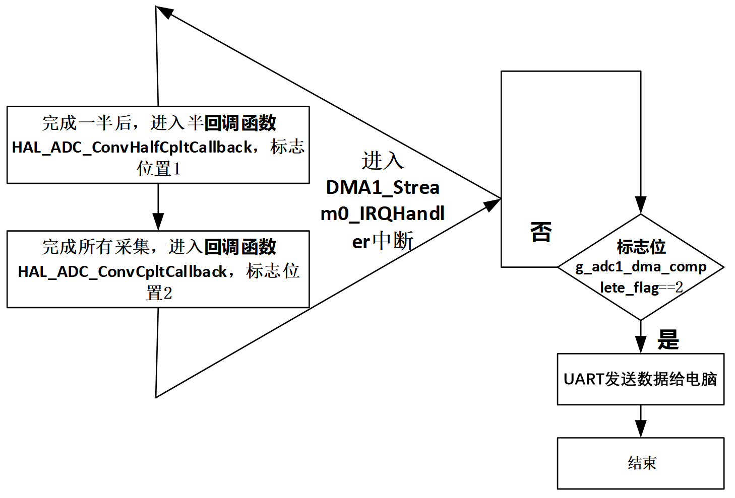 在while循环中,一直进行标志位判断,标志位是1时,处理前半部分12500个数据处理,标志位是2时,处理后半部分12500个数据处理。完成回调函数和半完成回调函数都是通过DMA1_Stream0_IRQHandler中断进入。
