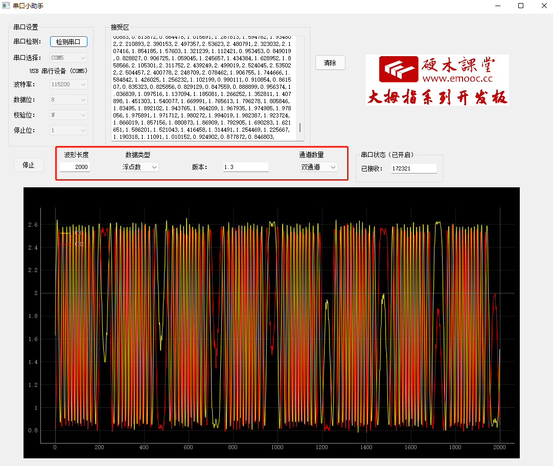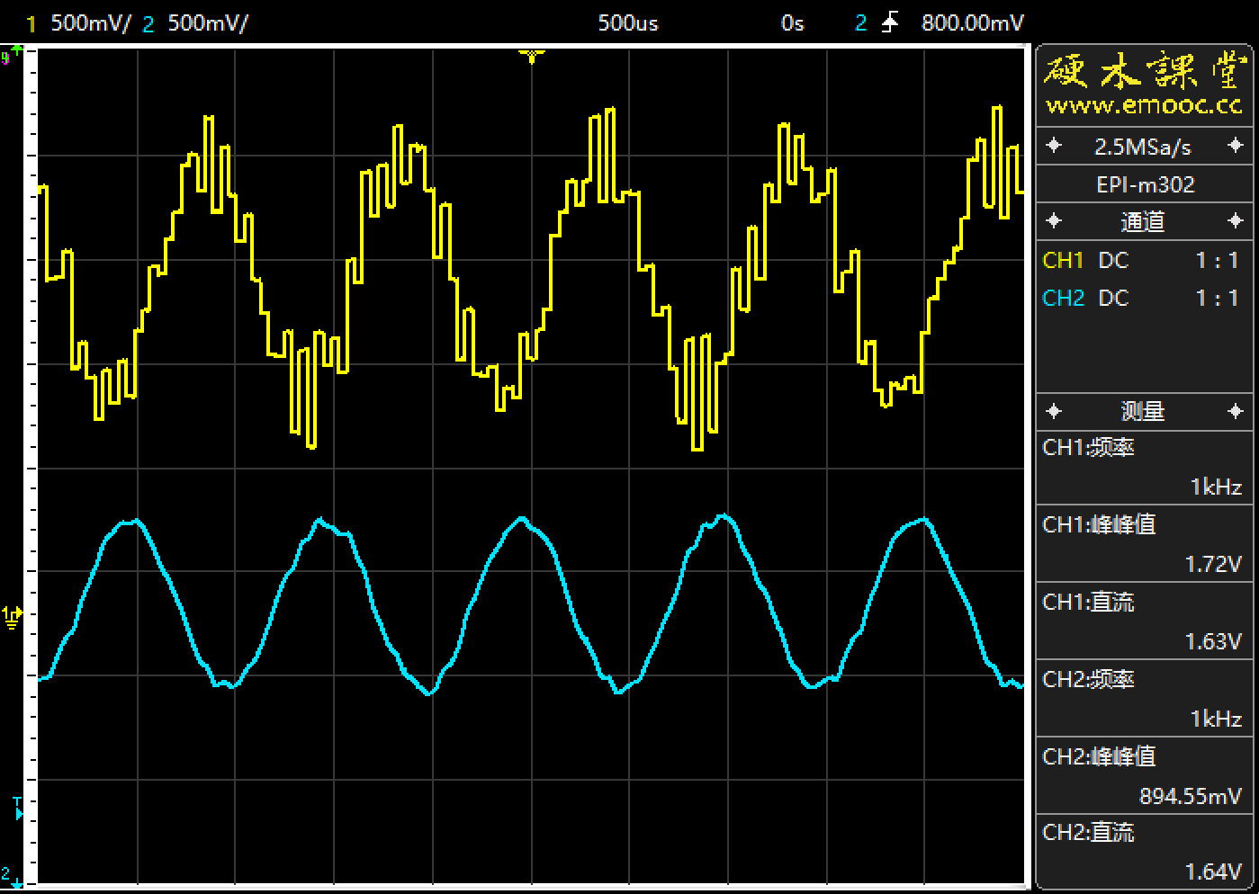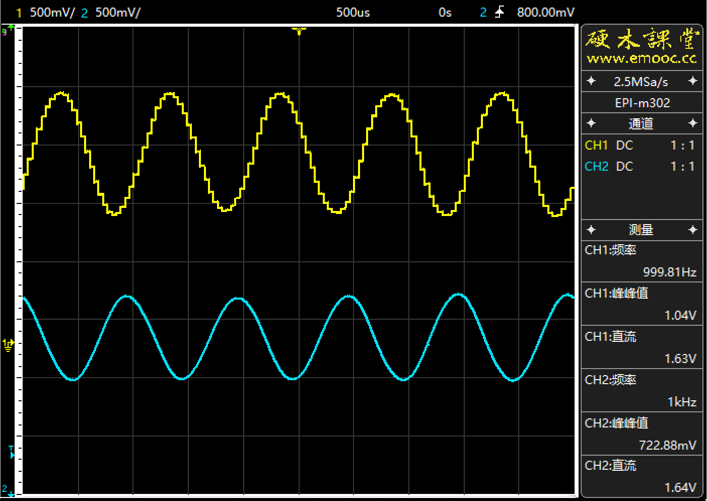 如果没有示波器,可以使用STM32内部ADC采集后通过UART传到上位机观察波形,请查看下一节内容。