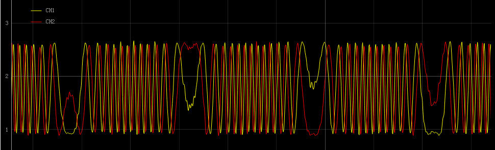 在前面程序中配置QN8027输出的单音FM信号在98.5M上,下面我们把MSI001的接收频点也配在98.5M,通过示波器查看MSI001芯片的IQ输出的波形。