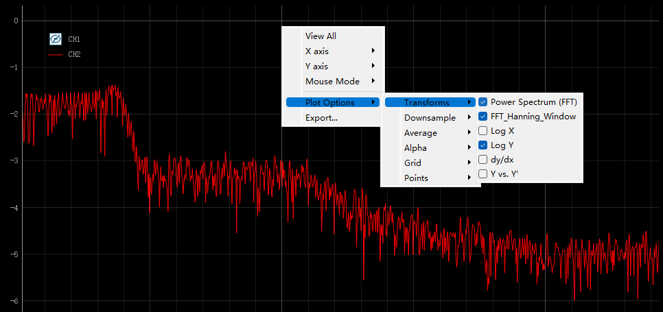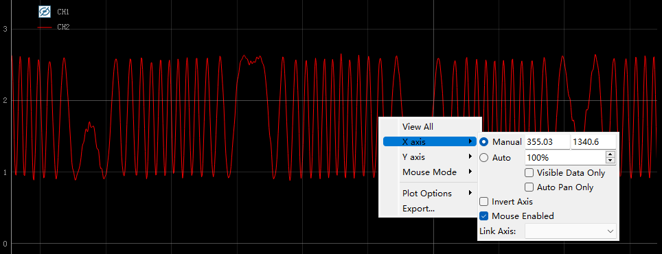 如果鼠标不能用,在波形显示界面点击鼠标右键,可以选择是否在X轴或Y轴启用鼠标: