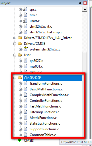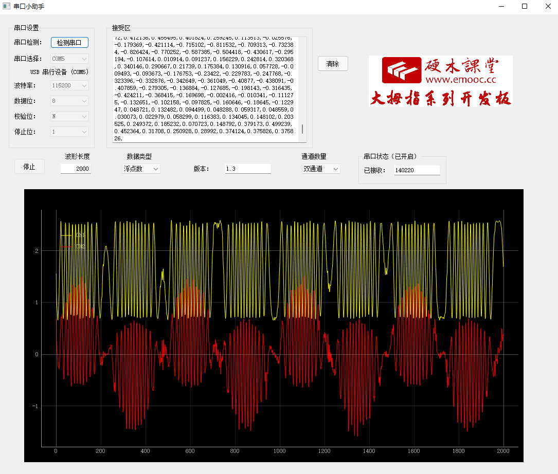 实现思路如下:将DMA采集输出长度设为2000个点,采集完前半部分1000个点后,进入半回调函数HAL_ADC_ConvHalfCpltCallback中,标志位置1;后半部分1000个点采集完成后,进入HAL_ADC_ConvCpltCallback,标志位置2,停止DMA采集;在主程序中如果标志位等于2,就将IQ数据发送到PC上位机显示,再开启DMA进行下一帧数据采集。这样确保我们看到的波形正确后,就可以进入下一节,进行后面的FM解调处理。