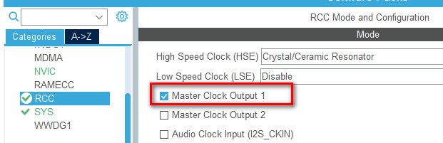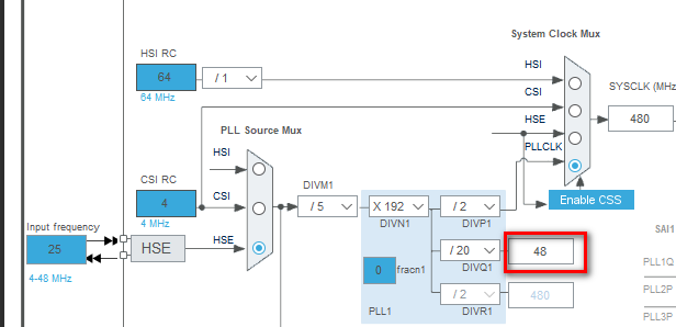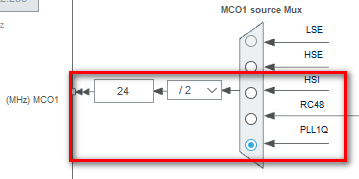 使能Master clock output1后,配置PLL1Q输出为48M,MCO1选择时钟源为PLL1Q,经过2分频后,得到24M时钟。