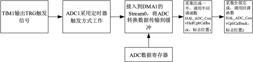 具体ADC同步DMA采集介绍,可以回顾基础实验 “实验二十四 ADC定时器触发配合DMA双缓冲实现实时采集”: