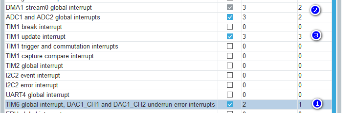 本例中我们要实现的功能为:定时器TIM1输出TRG信号触发500KSPS采样率的ADC1和ADC2,实现DMA双缓冲采集,进行实时采集->解调->每20个数据平均为1个数据->通过TIM6触发的刷新率为25KSPS的DAC发出。最后通过示波器观察DAC管脚波形。