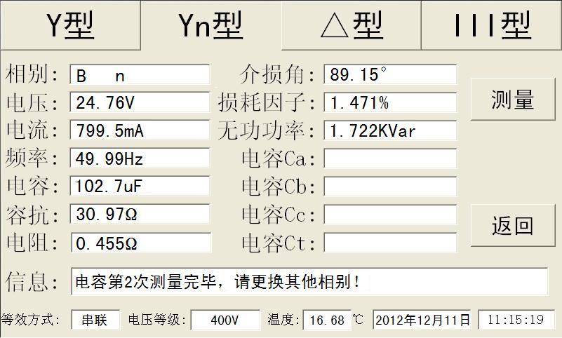 手动更换B相后,点击“测量”按钮,仪器自动完成B相的测量(如图3.6),再手动更换C相后,点击“测量”按钮,仪器自动完成C相测量,测量完成后如图3.7所示,“信息”栏中会提示“电容3种相别测试完毕,继续测试或更换网络测试”,同时界面出现“保存”按钮,此时一个Yn型的电容器组测试完成,点击“保存”按钮保存测试数据,以备事后查询。测试完成后,点击“测量”将开始下一组测试,点击“返回”按钮返回主界面。