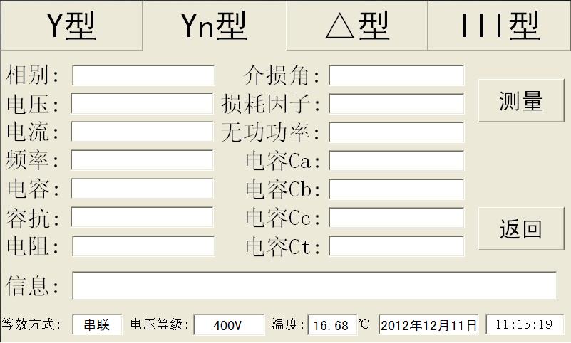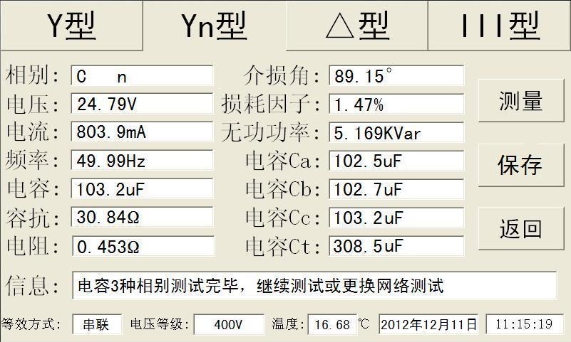 主界面中点击“电容测量”图标即可进入电容测试界面,点击屏幕上方选项卡可以选择Y型、Yn型、△型、Ⅲ型,下面以测试一个Yn型电容器为例。