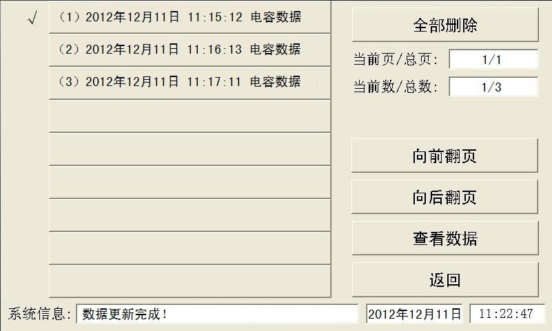 点击屏幕上的数据日期即可选择需要查看的数据,日期前的“√”表示该条数据被选中,点击“查看数据”即可查询被选中的历史数据,数据查看界面与电容测量数据界面相同。