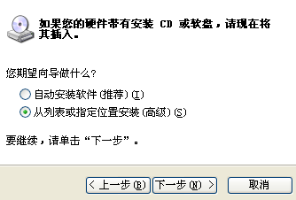 首次与PC联机需要安装USB驱动程序,连接好USB连接线后,打开仪器电源,电脑将会出现发现新硬件的提示,同时弹出安装驱动软件的提示,选择“从列表或指定位置安装”, 如图4.2所示。