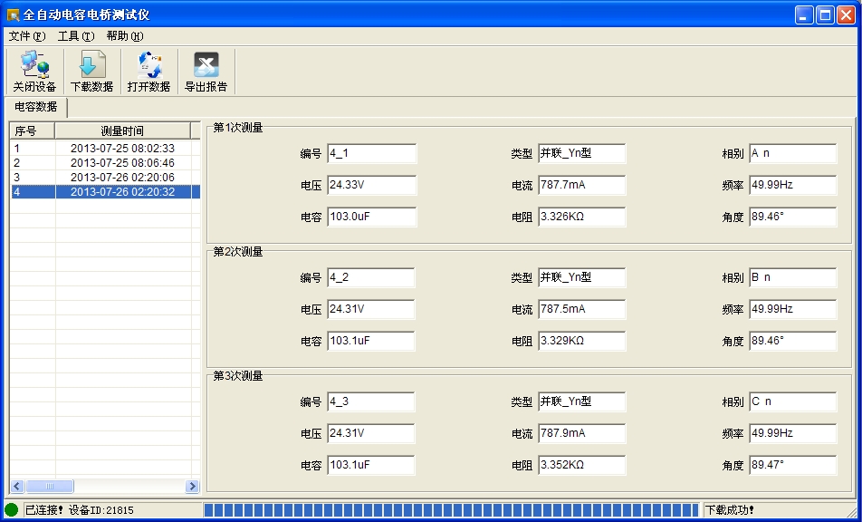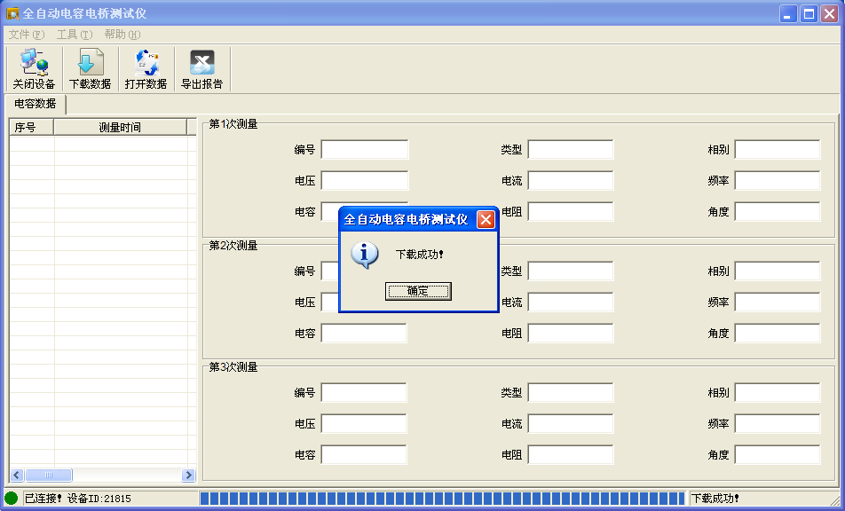 设置保存路径后,点击“保存”按钮,数据自动由仪器上传至PC机,下载完成提示“下载成功”,如图4.7所示。