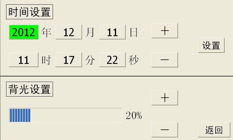 点击界面上的“系统设置”图标,进入系统设置界面(如图3.2)。在该界面中,进行时间设置和背光设置。