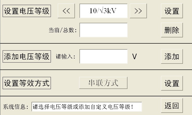 进行电容测试之前,用户需要根据被试品参数设置相应的测量参数,点击主界面中的“测量设置”图标进入测量设置界面(如图3.3)。在此界面,包含“设置电压等级”、“添加电压等级”、“设置等效方式”和“系统信息”四个标题栏。