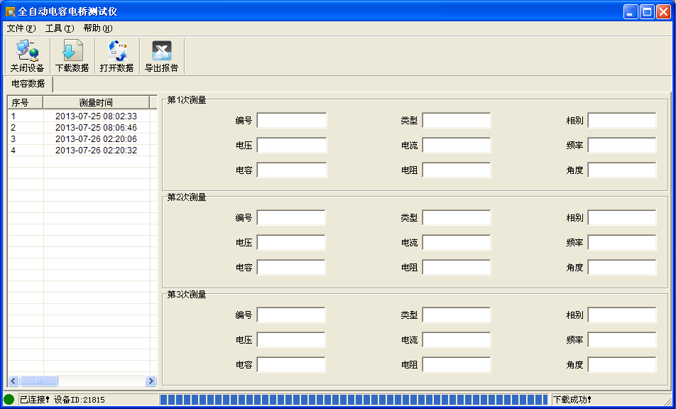 1.通信连接线连接好后,打开仪器电源,待仪器进入图3.1所示主界面后,点击“数据通信”,然后运行“全自动电容电桥测试仪.exe”,如图4.4所示。