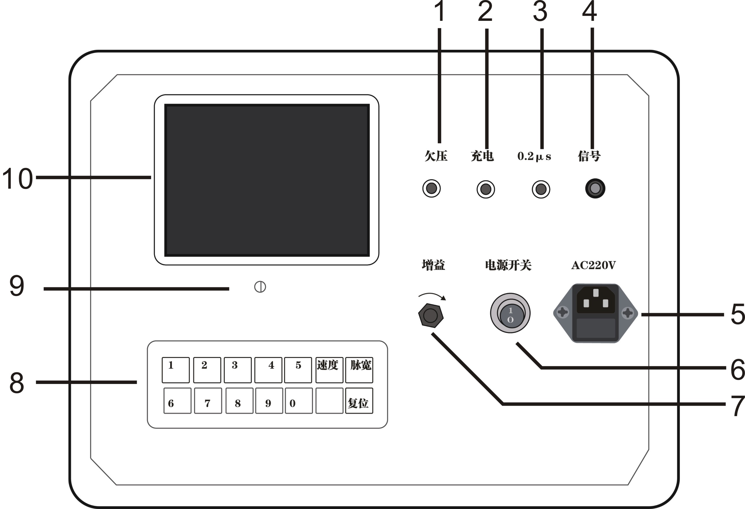 1.欠压指示 2.充电指示 3.0.2µs/2µs脉宽指示