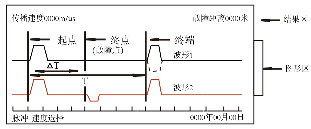 测量电缆故障时,电缆可视为一条均匀分布的传输线,在电缆一端加脉冲电压,则此脉冲按一定的速度(决定于电缆介质电常数和导磁系数)沿线传输,当脉冲遇到故障点(或阻抗不均匀点)就会发生反射,用闪测仪记录下发送脉冲和反射脉冲之间的传输时间△T,则可按已知的传输速度V来计算出故障的距离Lx,Lx=V·△T/2,如图10所示。