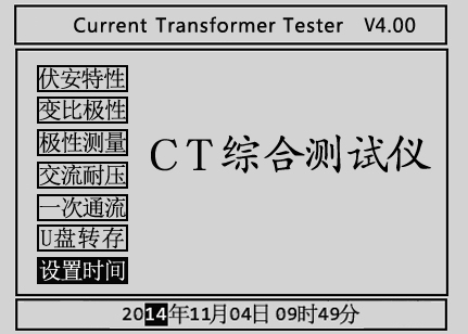 首先将AC220V或AC380V电源连接至仪器面板,打开面板上主电源开关,仪器进入开机画面,开机完成后仪器显示如图2.1所示画面,进入待机画面后光标指示的当前试验项目为伏安特性,当前选择项目的背景会反色。按下旋转鼠标即可进入伏安特性测试界面,转动旋转鼠标选中变比极性、极性测量、交流耐压、一次通流、U盘转存或设置时间。