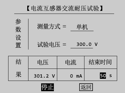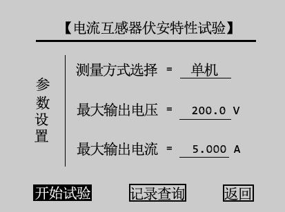 注:设置最大输出电压和最大输出电流可对电流互感器进行保护,在试验过程中,一旦电压或者电流超出设定值,仪器将自动停止升压并返回零位,试验自动结束。