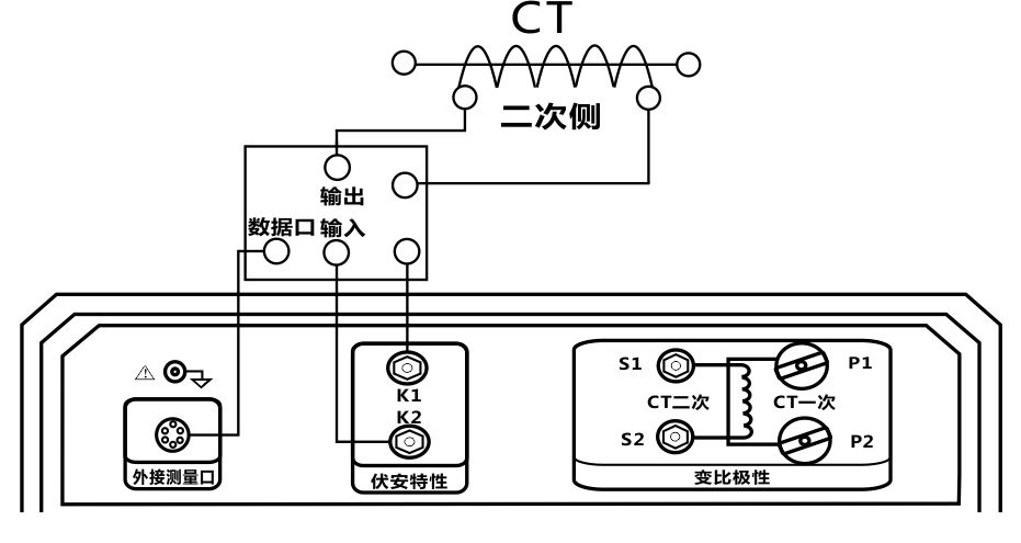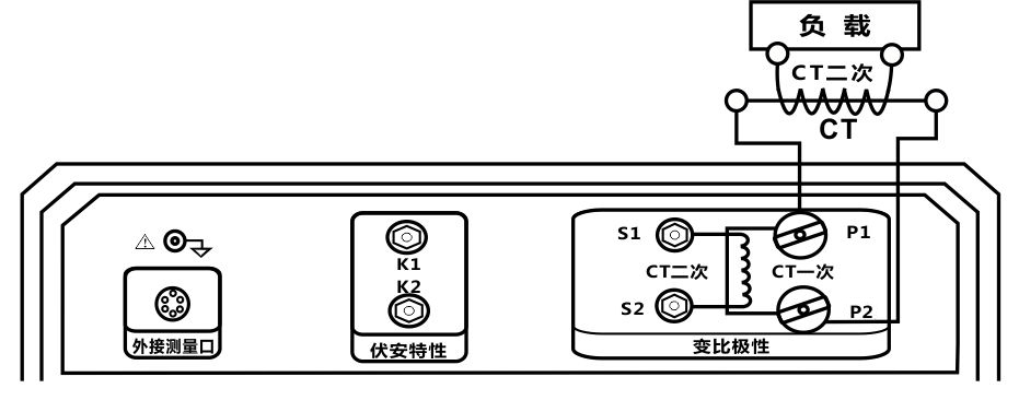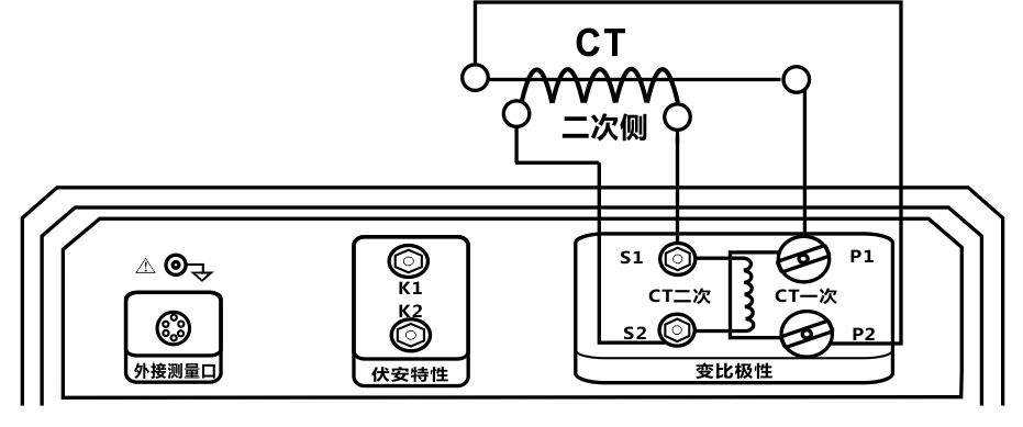 接线方式如图3.28所示,被测CT一次侧与仪器CT一次端子P1、P2连接,被测CT二次侧与负载连接。